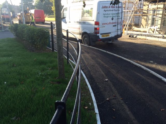 Picture showing park ranch style railing; Spec 1mtr high 4 bar rail 27mm OD tubing 1.6 mtr approx between legs .Sections approx 3.2 mtr bolted together.